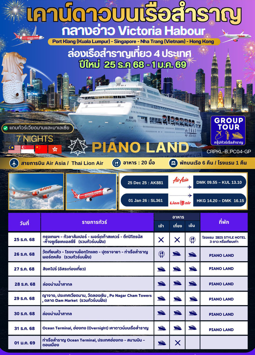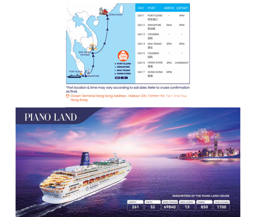 เส้นทางล่องเรือสำราญ 4 ประเทศ: มาเลเซีย สิงคโปร์ ญาจาง (เวียดนาม) ฮ่องกง |