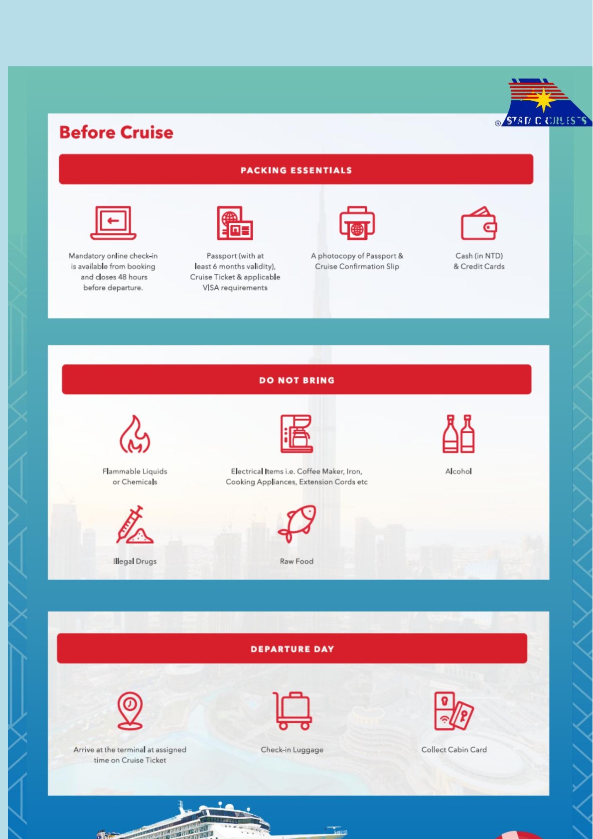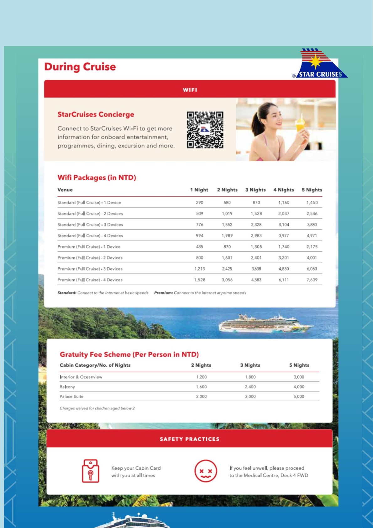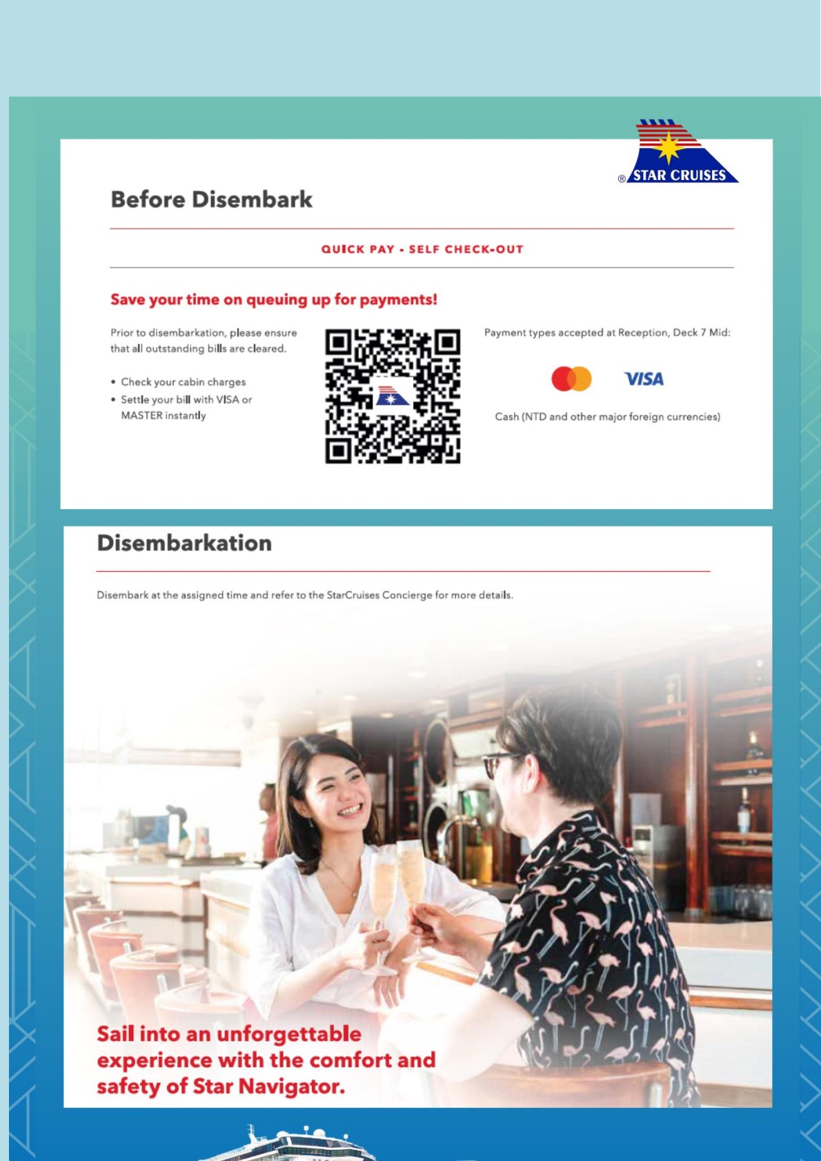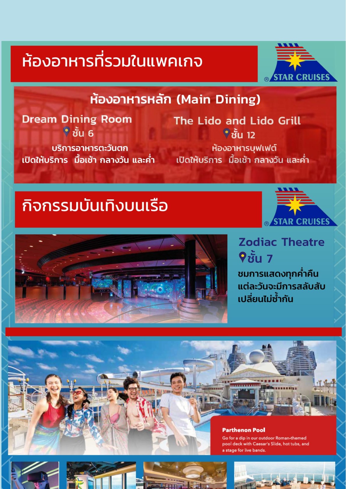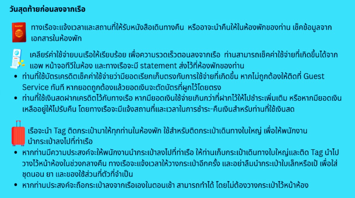 (หลังจากเรือล่องออกสู่น่านน้ำสากลแล้วร้ามค้าปลลดภาษีและศาสีโมจะเปิดให้บริการ)